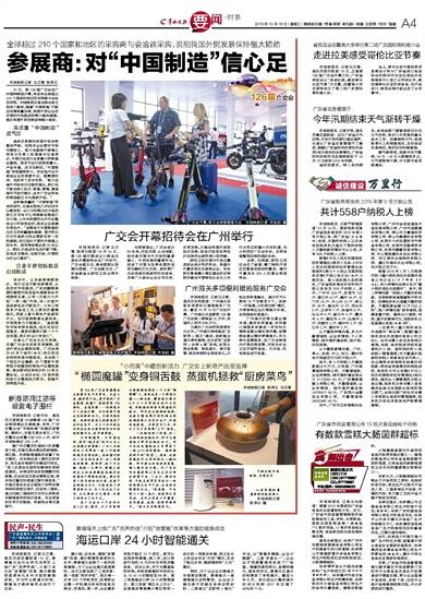 羊城晚报记者 马汉青 陈泽云 15日,第126届广交会在广州琵洲展馆开幕,将迎来全球超过210个国家和地区的采购商与会洽谈采购。羊城晚报记者在展会首日现场了解到,随着“中国制造”不断迈向高质量