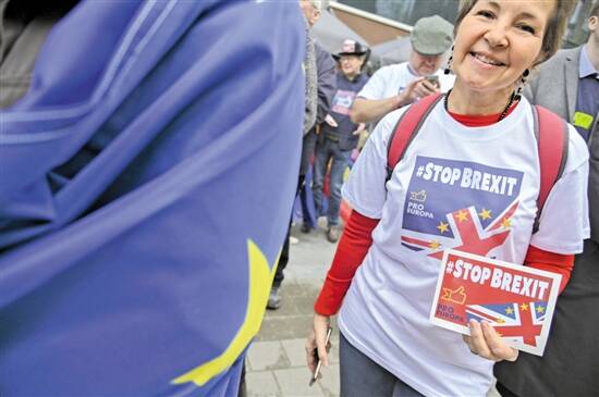 在位于比利时布鲁塞尔的欧盟总部外,一名女子手持标语参加抗议“脱欧”的集会 新华社 发 |