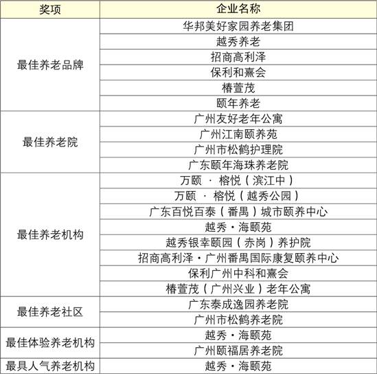 2018年,羊城晚报报业集团成功举办了第一届 “羊城金牌养老机构评选”活动,各知名养老机构纷纷参与,通过专家、读者实地走访的形式,对养老机构现状进行了全方位测评。集中展示各养老机构品牌形象、服务水平及产品特色,也使得“金牌养老机构”成为了养老行业的标杆。 今天,由羊城晚报报业集团主办,羊城晚报品牌传播中心、羊城晚报老友记俱乐部承办的“2019羊城金牌养老机构评选”又来了,快来看看你心水的养老机构上榜了没! 文/余燕红 养老机构选择多 权威评选来帮忙 作为超大型城市,截至2018年底广州市户籍老年人口数169.27万人,占户籍人口的18.25%。老年人口数超过20万人的区有3个,即越秀区、海珠区和荔湾区,老年人口数为10-20万人的区有5个,即白云区、番禺区、增城区、天河区和花都区;如何让老年生活有质量、有尊严一直是社会热点。 现在老人对养老的观念发生了巨大的变化,“养儿防老”观念已经成为过去式,许多老人不再依赖子女养老,更愿意规划自己的晚年生活。有的想和朋友、同学“抱团养老”;有的想冬天住在南方、夏天住北方的“候鸟式养老”,有的想离家不离亲,在“家旁边养老”……于是,近年来各种新型的养老机构、养老服务产品应运而生、层出不穷,比如嵌入式养老机构、养老公寓、旅居式养老院等。让这一代的老人们养老有了更多的选择,晚年幸福指数大幅提升!与此同时也带来“选择困难”的新问题。 正因此,作为华南主流大报的《羊城晚报》,在华南及广东、珠三角地区极具影响力,为了适应养老产业发展趋势,顺应市民、消费者的需求,继2018年评选出最受消费者认可的“羊城金牌养老机构”后,今年再度举办“2019羊城金牌养老机构评选”活动。 “老友记”逐家走访 用户体验最重要 本次评选面向养老机构、养老社区、养老院进行评选,分别从环境设施、医疗护理、膳食营养、文化生活等多维度对养老机构进行评审。根据养老机构性质、服务定位,本次评选设定最佳养老品牌、最佳养老社区、最佳养老机构、最佳体验养老机构、最具人气养老机构、最佳养老院等奖项。 为保障本次评选的权威和客观,主办单位邀请专家、羊城晚报老友记俱乐部会员、社会公益团体成员等组成评审团队,对机构进行现场考察、评分。最后综合现场评审和网络投票结果,评选出“2019羊城金牌养老机构”!在参观过程中,评委也充分感受到当今养老模式的新变化,优美的环境、贴心专业的服务,养老机构所追求的星级服务理念,让大家赞叹不已。 为做到公平公正 养老机构逐个看 “2019羊城金牌养老机构评选活动”是广州养老行业档次最高、影响最大的一次评选活动。本次活动最大的亮点是:从消费者角度进行评审,使得本次评选活动真正做到公平、公正、公开。评审团走访了以下养老机构—— 越秀银幸颐园(赤岗)养护院:位于海珠区赤岗西路,是广州首家配置康复医疗的中心,项目以“医养结合”为特色,跟三甲医院紧密合作,且活动场地宽阔、绿化率高,所有区域均设置了无障碍通道,大家纷纷点赞。此外,养护院还成立了银幸学院,让入住的长者们圆了自己的上学梦。 招商高利泽·广州番禺国际康复颐养中心:位于广州番禺金山谷社区,是广州首家中法合资的养老机构。这里让评审团们眼前一亮,中心装饰精美,色调暖和,主推失智失能照护,为每位长者提供个性化定制照护方案,目前有长期颐养居住、短期康复居住和家庭喘息等服务。 越秀·海颐苑:位于海珠区广纸路,是一所中法合作示范性养老项目,也是越秀养老旗下的市属国有企业,自2017年成立以来,一直以医养机构、康养公寓及康复医院为核心产品。评审团一致认为这里是体验最好的养老机构,这里环境优美,风格独特,引入法国餐饮服务商,提供的营养、美味的长者自助餐体验颇得大家好评。该项目已与珠江医院签订了医疗绿色通道服务,为海颐苑长者提供全面的医疗服务。 保利广州中科和熹会:位于黄埔区科学城中心区域——保利中科广场,和熹会内配备全方位的适老化设计,搭配明亮、温馨的装修风格让长者感受到温暖、愉悦的生活氛围,作为医养结合型养老机构,2018年获批长护险定点服务机构,2019成为医保定点服务机构。 万颐·榕悦(滨江中):地处海珠区滨江中路海珠桥旁,是万颐打造的长者文化艺术生活中心,覆盖广州越秀、海珠两大核心城区,交通便利。周边医疗资源丰富,坐拥一线江景,环境优美,为长者提供优质逸居的医养康乐综合服务,颐养时代生活。 广东百悦百泰(番禺)城市颐养中心:是以生机养老、医养结合为理念的新型养老照护机构,倡导“孝心、专心、贴心、开心、安心”的“五心服务”标准。配置专业人员,以机构、居家、社区三位一体模式,为长者提供全日制 “身、心、灵”全方位安养服务。 除此之外,评审团还分别前往了广州市松鹤养老院、广州江南颐养苑、广东泰成逸园养老院、椿萱茂(广州兴业)老年公寓、广州颐福居养老院等机构参观,了解目前养老市场的实际情况,通过对比寻找出更适合自己的机构。 有含金量的评选 养老机构来参与 本次活动从今年8月正式启动以来,引起社会各界的极大关注,各大养老机构踊跃报名参与。共有超过60家本地养老机构提出申请参与本次评选。 经过评审委员会的综合审核评定,最终确定了6个养老品牌、15家养