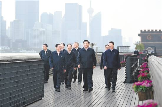 11月2日下午,习近平在杨浦区滨江公共空间杨树浦水厂滨江段,沿滨江栈桥步行察看黄浦江两岸风貌 新华社发 |