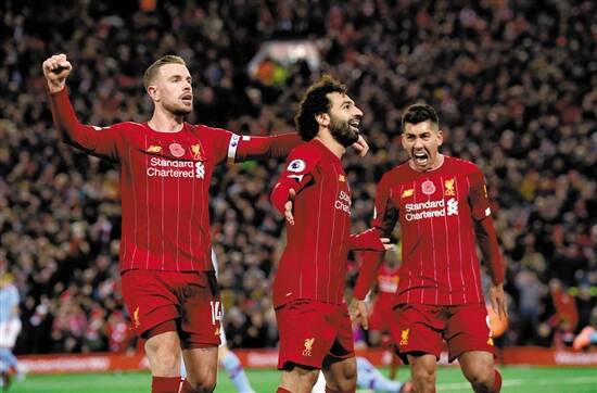 利物浦的萨拉赫(中)进球后 图/视觉中国 |