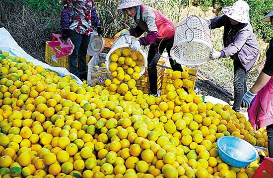 江西省寻乌县晨光镇湖岽村的果农集中堆放刚采摘的脐橙 新华社发 |
