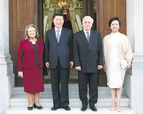 会谈前,帕夫洛普洛斯为习近平举行隆重欢迎仪式。这是习近平和夫人彭丽媛同帕夫洛普洛斯和夫人弗拉西娅合影 新华社发 |
