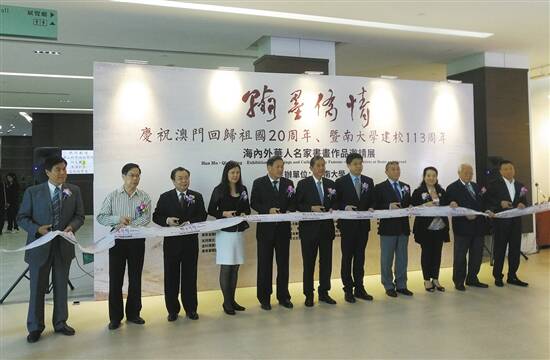 11月10日,为庆祝澳门回归祖国20周年、暨南大学建校113周年,“翰墨·侨情——海内外华人名家书画作品邀请展”开幕式在澳门科技大学举行,由此也拉开了暨南大学“翰墨·侨情”巡展的序幕。此次活动由暨南大学主办,澳门科技大学人文艺术学院、新西兰中国书画院等协办,中央人民政府驻澳门特别行政区联络办公室宣传文化部部长万速成,暨南大学副董事长马有恒,暨南大学原校长胡军,澳门科技大学副校长邝应华,暨南大学副校长洪岸,广东省文联党组成员、专职副主席周华,广东省侨联党组成员、秘书长曹堪宏,台湾研究院岭南美术馆荣誉馆长欧豪年,美国华人艺术家协会顾问詹忠效及参展书画家代表共200多人参加了开幕式。 本次书画展展出了海内外诸多著名书画家的作品。80多岁高龄的岭南画派领军人物陈金章、欧豪年等均受邀参展,并为画展送出最具代表性的作品;为了使展览更具时代性和贴近性,同时突出主题性,主办方还分期组织了60位海内外艺术家们到江门、台山、恩平、中山等主要侨乡、侨校实地釆风写生,深入体验新时代背景下的广东侨情,见证了广东侨乡、侨校的巨大变化与发展。画展还将在海内外多个城市进行巡展。 (古月)