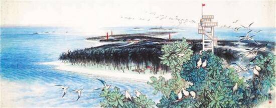 羊城晚报记者 朱绍杰 画事拾零 1974年“西沙之战”告捷,中国文艺界以南海海疆为题材,兴起一系列的创作热潮,广东画家更为此留下一批作品—— 在“我和我的祖国——庆祝中华人民共和国成立70周年广东优秀美术作品展”上,著名画家林墉所作的《西沙风光》引人注目。作品描绘的是西沙的海防前线,画面中驶向深海的船舰、高耸的哨塔、训练的靶场都暗示着平静中的波澜,而正抵挡着狂风袭击的椰林和勇敢的边防战士如一道道铜墙铁壁守卫着祖国的南疆。 《西沙风光》尺幅巨大,占据了展厅一整堵墙。更引起观众注意的是,这幅“吸睛”大画的标签上竟标识为“年代不详”。而在同期展出的西沙题材作品,陈洞庭所作《西沙椰林》亦未辨识出定稿何时。这两幅同时代画家的同题创作,恰是新中国七十年艺术探索创新的一个切面,钩沉广东美术界,乃至全国文艺界的一段“海洋”往事。 林墉烧了几麻袋速写 “当时交接给我们的时候这两件作品就写着年代不详”,广东美术馆典藏部主任胡宇清告诉记者,林墉《西沙风光》、陈洞庭《西沙椰林》原藏在广州迎宾馆,2017年移交广东美术馆。 广东画院理论研究室副主任麦荔红告诉记者,广东画院还藏有另一幅西沙题材作品,由林墉与伍启中、周波合作的《北京送来的礼物》。过去,中国艺术家的表现对象多为大江大河,少有海洋海岛。麦荔红认为,这些表现海洋海岛风光的西沙题材画作均创作于同一个历史时期,有着相同的时代背景。 麦荔红对记者表示:“在反映时代主题与建设祖国边疆的背景下,广东的一批艺术家前往西沙群岛考察写生,其中包括关山月、林墉、陈洞庭等。” 自上世纪70年代开始,林墉就以清新洒脱的笔墨情趣和富有南国秀美温和特色的人物画创作为画坛所瞩目。《西沙风光》作为一件具有鲜明时代特征的山水景物画作品,在林墉的早期创作中并不常见。林墉在接受羊城晚报记者采访时表示,《西沙风光》之所以没有落款具体创作年份,是因为自己感觉那幅作品还画得不够满意,年轻时也为此烧了几麻袋的写生速写。 文艺创作的『西沙热』 1974年1月,中国人民解放军海军南海舰队一部与陆军分队、民兵协同,对入侵西沙群岛的南越军队进行反击作战,史称西沙群岛自卫反击战(以下简称“西沙之战”)。“西沙之战”打响后不久,军旅诗人张永枚写出了长篇诗报告《西沙之战》,著名作家浩然则完成了长篇小说《西沙儿女》,拉开了全国文艺界对于“西沙”同题创作的时代之风。 西沙的广阔天地、火热的时代背景为当时像林墉这样的中青年画家,提供了创作的灵感、题材和舞台。1974年正值全国美展。自西沙归来的年轻画家们回来就进行如火如荼的创作,为全国美展做准备。10月,林墉的《战地新歌》及《北京送来的礼物》亮相“建国25周年全国美展”。《人民日报》在报道中强调,展览反映“西沙之战”的重大题材。 据记者不完全统计,以上世纪70年代西沙为背景创作、写生的画家就有:黄胄、郭绍纲、谢耀庭、曾照欣、彭强华、招炽挺、吕恩谊、艾民等。其中关山月女婿、画家陈章绩的成名作就是创作于上世纪70年代的《西沙丽日》。 广东画家在“西沙”题材创作上独树一帜,不仅得近水楼台之利,更与创作者的长期储备有关。据周波的“艺术活动年表”记载,早在1973年,他就与林墉到西沙群岛去体验生活。 艺术家必须亲临现场 其实,在林墉与周波到西沙群岛体验生活的之前一年,著名画家梁世雄就随南海舰队军舰前往西沙,登上永兴岛体验海岛生活。日前,年近九十的梁世雄先生在家中整理旧作,发现了一幅超过六平方尺的大幅国画《红日照西沙》,他向记者讲述了这幅从未发表、从未参展的西沙画作的创作前后。 1972年,恰逢南海舰队派人到广州美院进修,梁世雄等人与部队画家自此结下深厚友谊。在部队同仁的牵桥搭线下,梁世雄、郭绍纲及汪宗伟三人结伴登上南海舰队护卫舰503号,前往西沙群岛采风写生创作。 “当时听说能够去南海看一看,很是兴奋,毕竟自己去过高山高原、大江大河,但没有切身处地地面对过大海。”此前,梁世雄走访中印边境,为人民大会堂西藏厅创作边防题材。“登山则情满于山,观海则意溢于海”是他多年的创作心得。对于他来说,艺术创作要求艺术家必须亲临现场。 回忆起四十年前的西沙之旅,梁世雄依然历历在目。“我到了西沙群岛,那里的海浪盖脸而来,但我不怕。很多同行的战士来自山东,不适应风浪,但我在甲板上安然自得。这对我创作很有利。” “那次我从出发到回来,前后约一个星期。是我第一次在大海上长时间体验生活。来回西沙的路途风光、经历让我大开眼界。”西沙之行让梁世雄留下了深刻印象。梁世雄说:“我在画长江的时候,注重表现“不尽长江滚滚来”,即江水绵延向前的动感。西沙之行后是我第一次画大海。大海给我的感觉是开阔,一望无际,这是大海最突出的特点,也是和江河最大的区别。” 在中国历史上,描绘海洋的绘画作品比较少,其中不少还是神话中的海上仙山。在中国传统艺术史中,历朝历代的艺术家的创作对象往往是花鸟山水,少有表现海边的事物。可以说,表现海洋事物在传统绘画中并非主流。近代以来,特别是20世纪以来,不同的区域特色开始在绘画中得以展现。新中国成立以后,海洋题材的画作大都紧扣社会