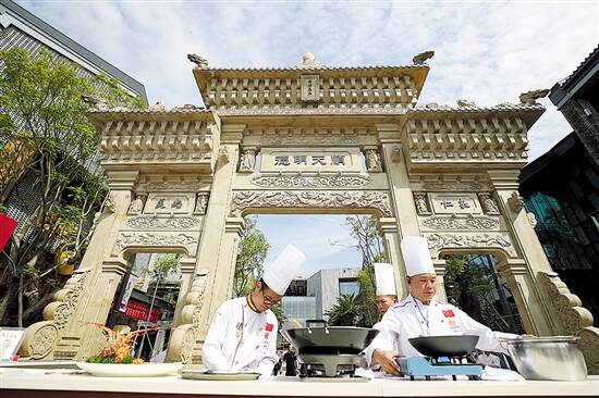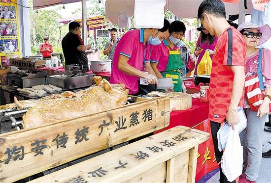 消费者在佛山美食文化周上品尝顺德名吃“均安蒸猪” |
