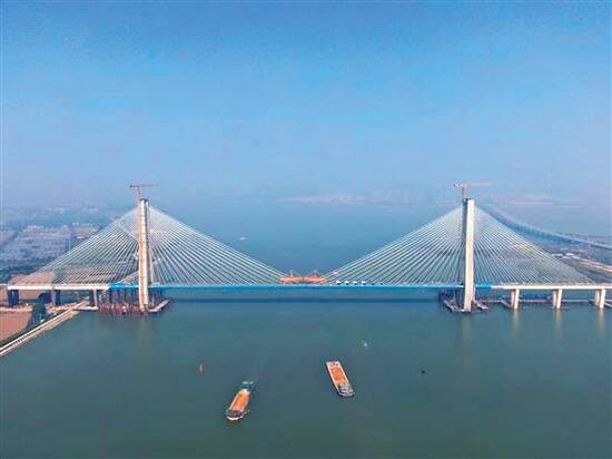 羊城晚报讯 记者马灿,通讯员王建国、郑清平、李守钦摄影报道:12月27日下午,粤港澳大湾区核心地南沙港铁路龙穴南水道特大桥,随着最后一节钢箱梁的架设,经过施工人员精湛的焊接作业,大桥实现胜利合龙(上图)。 记者从负责施工的中铁广州工程局集团二公司了解到,广州南沙港铁路龙穴南水道特大桥是全线控制性工程,是国内乃至世界上第一条海铁联运的客货两用铁路桥梁,也是目前广东省境内最高的铁路斜拉桥。 龙穴南水道特大桥跨越830米珠江龙穴南水道,塔高155米,主跨448米,全桥72对斜拉索,主墩桩基由24根3米大直径钻孔灌注桩组成,最大孔深85米。主桥共有47节钢梁,钢梁总重9656吨;另外还有总重1310吨的斜拉索,全桥用钢量近11000吨。 大桥施工创新多种新技术和新工艺,其中深水货运重载铁路大跨度斜拉桥中采用钢绞线斜拉索、大节段钢箱梁整节段拴接均为全国首创,混凝土梁风嘴采用PPS材质,这种材料用于特大型桥梁为全国首次。