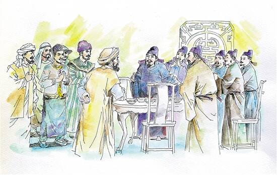 □撰文/蔡鸿生 题图/陈汉翔 广州是唐宋时代的著名贸易港,海舶往来,络绎不绝。作为中世纪香料贸易的集散地,“广府”(广州都督府)收课丰厚,号称“天子南库”。乳香、龙脑、丁香、胡椒,以及象牙、犀角等形形色色的舶来品,按“榷货”抽解专卖,往往又以“广货”之名行销内地,影响极其深远。清代诗人袁枚有“岭南从古称香国”之句,充分概括了市舶时代(明代中期以前海外贸易时代)广州口岸的贸易特征。 早在唐玄宗开元二年(714),广州已有市舶使(管理海外贸易事务的官员)行使职权。至宋太祖开宝四年(971),置广州市舶司,逐步形成一套管理海外贸易的体制和礼仪。 官办的礼宾宴请 宋代来往广州的海舶,受自然条件所制约,必须靠季候风航行。大体而言,其航程是冬往夏归(冬天从广州起泊,夏天返航):“船舶去以十一月、十二月,就北风。来以五月、六月,就南风。”候风之期,约半年左右。 有的外国商人因要出售商品、维修船舶和采购回程物资,一整年都待在广州不回国,就叫“住唐”,“诸国人至广州,是岁不归者谓之住唐。”蕃商“住唐”期间,居住于“蕃坊”(或称“蕃巷”),受“蕃长”约束管理。“蕃长”均由外国人担任,但要得到官府的批准。 当这些外船要启碇回国之前,广州市舶司的提举官,为表示顺风相送,会设宴饯行,这就是市舶宴。《岭外代答》(南宋周去非著)一书说道:“岁十月,提举司大设蕃商而遣之。” 设宴地点在“海山楼”,位于广州城南市舶亭之侧,面临珠江,即《萍洲可谈》(宋代朱彧著)所记:“广州市舶亭,枕水有海山楼。正对五洲,其下谓之小海。中流方丈余,舶船取其水,贮以过海则不坏。”以上情况,是朱彧于宋崇宁年间(1102-1106)随父游宦广州的直接见闻。可知,市舶宴之制,创于北宋。南宋的广州市舶司,继续遵行,遂成定例。 市舶宴的规模多大,没有明确记载。应邀赴宴者应该不是全体海商和船员。据绍兴二年(1132)六月二十一日广南东路经略安抚市舶司奏:出席者只是诸舶的货主船长和舵师等代表人物,宴请的费用由官府支出。一般来说,公费的宴请,只是一种礼节性的聚会,规模是有限制的,不可能大吃大喝。 据曾任广南市舶司提举官的楼王寿于绍兴十四年(1144)奏称:“每年十月内,依例支破官钱三百贯文,排办筵宴。”按宋代钱制有铜、铁之分,官钱当为铜钱。折合绍兴年间金价,“金每两三十千”,则市舶宴费金十两,相当于官方配卖僧尼度牒出家证书两三道的价钱。由此可见,宴请只是礼节性的,花费并不多。 海山楼的市舶宴为官办的礼宾酒会,官商递奏,劝酒助兴,一派蕃汉齐乐景象。南宋诗人洪适的《番禺调笑》,有《海山楼》一题专咏其事: 高楼百尺迩岩城,披拂雄风襟袂清。 云气笼山朝雨急,海涛侵岸暮潮生。 楼前箫鼓声相和,戢戢归樯排几柁。 须信官廉蚌蛤回,望中山积皆奇货。 宴会上的歌舞,有“乐语”为序幕,包括“致语”(骈文)和“韵语”(诗歌)两部分。据《资治通鉴·唐懿宗纪》“咸通九年九月”条胡三省注:“今诸蕃府有大宴,则乐部头当宴致辞,称颂宾主之美,所谓‘致语’者是。”张邦基《墨庄漫录》卷九云:“凡乐语不必典雅,惟语时近俳乃妙。”洪适就有颇妙的《设蕃乐语》,对宴会宗旨、市舶政绩及顺风祝愿,逐一表述。 市舶宴上都有哪些美味佳肴 唐宋时代广州的海舶,名目繁多,有南海舶(东南亚的船,以印度尼西亚的为多)、波斯舶(波斯湾阿拉伯国家的船)、昆仑舶(东南亚的船,以马来西亚的为多)、师子国舶(斯里兰卡的船),等等。舶商以大食(阿拉伯国家)蕃客为主体,或来自波斯湾的瓮蛮(阿曼),大多奉行伊斯兰教,崇尚阿拉伯文明。因此,市舶宴一定会尊重他们的饮食习惯,排除他们禁忌的菜肴。至于饮料和果品,当然也应适合他们口味,否则,“示慈之宴”就令人望而生畏了。 宋代正式宴席上,主宾每次集体饮完一盏酒,就要换一次菜肴(或主食),同时还要换一套节目(艺人在宴席前表演戏剧、魔术、相声、歌舞、杂技、相扑之类)。宴席规格有高有低,持续时间有长有短,规格越高,时间越长,举杯的次数就越多,换菜的次数也就越多,有三行、五行、七行、九行、十三行、十五行之分。三行,就是饮酒三盏,换三次菜。五行,就是饮酒五盏,换五次菜。依此类推。 陆游的《老学庵笔记》就记录了招待金国使者的“九盏”宴席情况。当时,陆游在膳部司担任郎中。膳部司是礼部的下属机构,相当于文化部兼外交部旗下的饮食服务总公司,负责操办大型宴会。“九盏”有以下的主食和菜色—— 第一:肉咸豉。这是用味噌和羊肉做的汤。 第二:爆肉(双下)、角子。爆炒羊肉上两份,外加有棱有角的长包子一份。 第三:莲花肉油饼、骨头。莲花肉油饼是荷花造型的肉饼,骨头是煎炸排骨。 第四:白肉、胡饼。白肉即清炖羊肉,胡饼就是烧饼。 第五:群仙炙、太平毕罗。前者是烤肉,后者是馅饼。 第六:假圆鱼。用素菜制作的仿荤甲鱼。 第七:奈花索粉。一种制作精美的高档米线。 第八:假沙鱼。用粉丝和肉冻制作的仿荤鲨鱼。 第九:水饭、咸豉、旋鲊瓜姜。水饭是半发酵的酸酸甜甜的稀米粥,咸豉是味噌汤,旋鲊瓜姜是现切现腌的菜瓜片和姜片。 广州市舶宴是否也按“九盏”的规格办,不得而知。参照北宋广州府帅的官宴,有“鬼奴金盘献羊肉,蔷薇瓶水倾诸怀”,以及“元戎要宾锤大鼓,老蛮献馔烧肥羊”之类的场面,则市