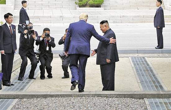 今年6月30日,特朗普在板门店与金正恩握手会面后,跨越军事分界线来到朝方一侧 新华社发 |