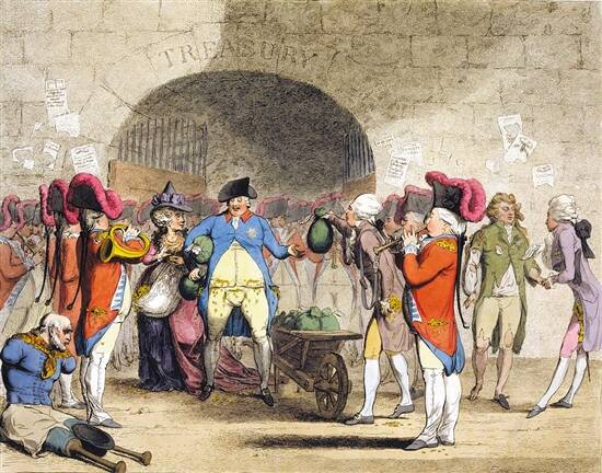 臣民向英国国王乔治三世支付税款,英国漫画家詹姆斯·吉尔雷作于1786年 |