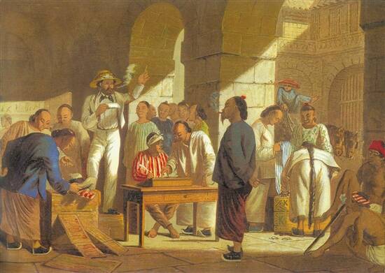 1858年《伦敦新闻画报》的画作,表现一位英国商人在广州街头叫卖他的商品 |