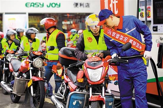 “返乡摩骑”排队加油 羊城晚报记者 宋金峪 摄 |