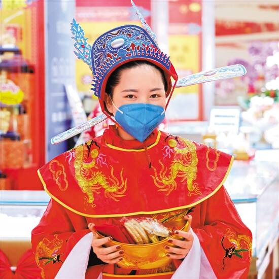 大年初二,广州大多数街坊出门都戴上口罩,做好防御,就连商场的“财神”也做足防护 羊城晚报记者 陈秋明 摄 |
