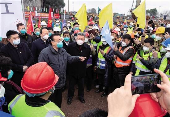 李克强在武汉火神山医院工地,勉励工人们加班加点,加快建设进度 新华社发 |