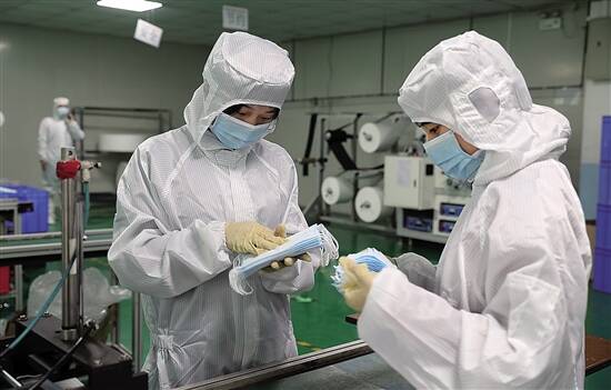 医用防护类企业正在加快复产,工人们加班加点赶制口罩 羊城晚报记者 唐波 摄 |