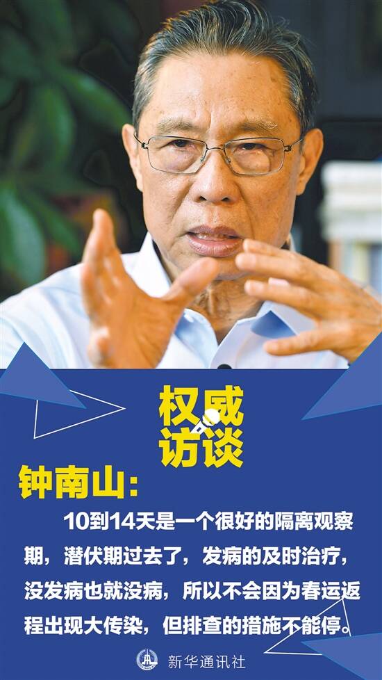1月28日,中国工程院院士、国家呼吸系统疾病临床医学研究中心主任、高级别专家组组长钟南山就新型冠状病毒感染的肺炎疫情接受新华社采访。他表示,目前国内已经对新型冠状病毒引起的肺炎做到早发现、早隔离,有信心防止大爆发。至于本次疫情何时会达到高峰,钟南山说,“疫情何时达到高峰很难绝对估计,但应该在一周或者10天左右达到高峰,不会大规模地增加了。” ●疫情是多点局部爆发还是大面积蔓延? 目前还是局部大爆发 ●“超级传播者”是否已经出现? 现在还没有,以后很难说 ●疫情预计还要持续多久? 不会比SARS五六个月长 ●疫情攻关科研进展如何? 进展顺利, 考虑中医一开始就介入 ●何时能接种新型冠状病毒疫苗? 起码要三到四个月 整理/唐珩 供图/新华社 详见A5