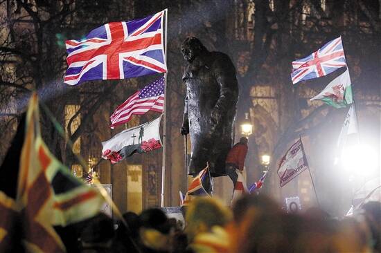 1月31日晚,在英国伦敦,支持“脱欧”的人们在议会广场集会,庆祝“脱欧” 新华社发 |