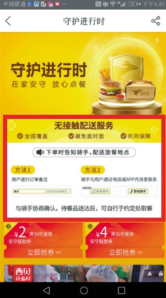 ▶用户在美团外卖下单时,可选择“无接触配送”服务 |