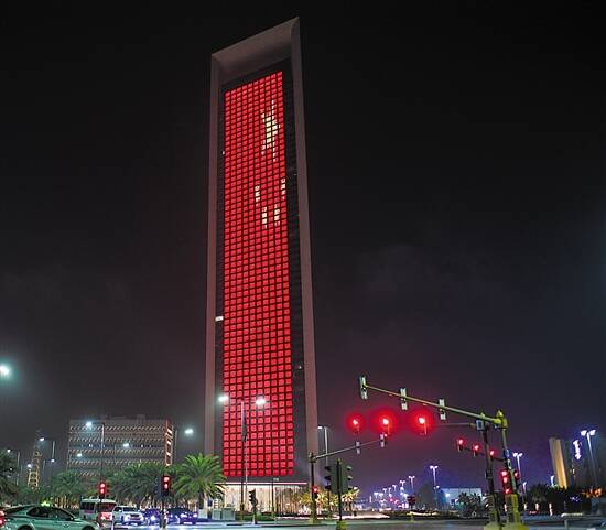 2日,在阿联酋阿布扎比,当地地标建筑物阿布扎比国家石油公司大楼点亮中国国旗,为中国抗击疫情加油 新华社发 |