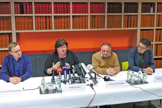2月4日,在比利时布鲁塞尔,比利时卫生大臣玛吉·德布洛克(左二)在记者会上介绍情况。 多国卫生部门4日报告本国新增新型冠状病毒感染病例,其中新加坡首次出现社区传播病例,比利时报告首例病例。 新华社发