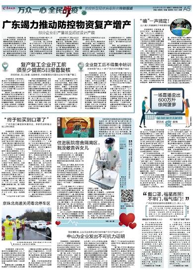 羊城晚报讯 记者孙晶、通讯员粤工信报道:新型冠状病毒感染的肺炎疫情发生后,广东省疫情防控指挥部办公室物资保障一组(下称“物资保障一组”)迅速启动重点防控物资生产企业生产情况动态监测,摸查