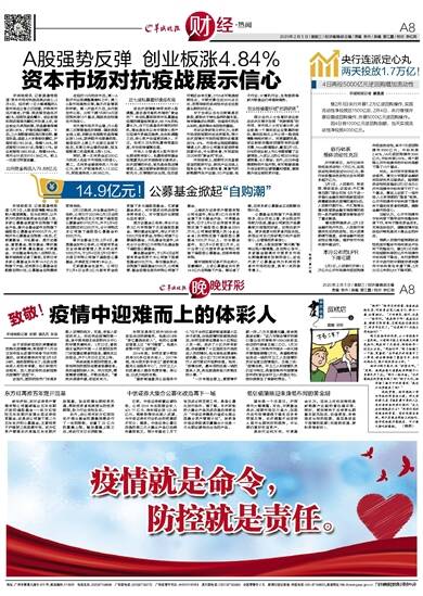 羊城晚报讯 记者莫谨榕报道:资本市场对抗疫战展示信心,2月4日,经历前一日大幅调整的A股市场在立春之日回暖。沪深两市低开高走,沪指、深成指早盘低开逾2%,但很快直线攀升。创业板指和深成指