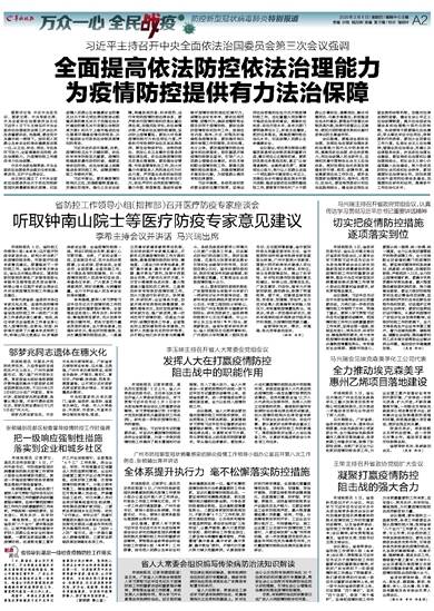 羊城晚报讯 记者张璐瑶报道:连日来,广东省人大常委会持续深入学习贯彻习近平总书记关于疫情防控工作的重要讲话和重要指示精神,贯彻落实省委工作部署,积极发挥人大职能作用,带头学习并认真落实传染病防治法