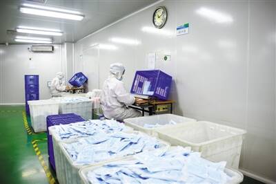 广州番禺4家医疗防疫物资生产企业全面复工。图为2月7日,番禺沙湾某医疗器械公司正在生产口罩 羊城晚报记者 梁喻 摄 |