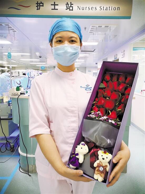2月14日情人节,奋战在广州中山大学附属第三医院疫情防控一线的巾帼英雄们收到节日的鲜花。这份心意来自远在武汉支援的“另一半”。同为医护人员的夫妻虽暂时分隔两地,但疫情和距离阻隔不断爱情的表达。 这是一场浪漫的接力 2月14日上午,中山三院门口,一束束娇艳欲滴的鲜花送到护士们手中。 “她们都很意外,有人一开始接电话时还以为我是骗子。”负责这次鲜花配送的快递小哥胡先生告诉记者。 情人节前夕,正在武汉抗疫第一线的广东医疗队的几位医生在闲聊时无意间分享了一个愿望:他们希望能在情人节当天,给同在广州医院坚守的“另一半”送上一束鲜花。“结婚那么久,我都没给她送过,来了武汉之后,特别想给她买一束花送过去,感谢她的支持和理解。”中山三院检验科主管技师潘顺文说。 医护人员的小小心愿,被一直为他们提供医护特供餐的外卖工作人员默默地记在了心里,他们通过外卖平台为医生们物色了一家在广州中山三院附近的花店。 花店老板向先生听说事情的原委之后,立马提出“不收医护人员一分钱”。“我是武汉人,能为医护人员完成这么有意义的心愿,我非常开心!” 对于送花的小哥胡先生来说,能在非常时期完成这样一个任务,他非常激动:“特别荣幸能接到这个任务,通过这种方式为医务人员加油鼓劲。” 分外感到家人的珍贵 接到外卖小哥的电话,代群非常意外,“虽然往年情人节他也会偶尔给我送礼物,但今年还是非常特别,我很感动。”代群是潘顺文的妻子,也是中山三院新生儿科的一名护士长。 今年除夕夜,广东第一批支援武汉医疗队整装出发,其中中山三院共派出23名骨干。潘顺文在除夕当天下午收到医院征集令,没有多想便报了名。“那天下午四点半发了通知,半小时后就有70多个人报名,经过层层筛选,我们检验科最终派了三个人。”潘顺文说。 临行前,妻子代群为他收拾行李。第二天,代群自己也迅速投入到本科室的值班工作。分别已经20天了,潘顺文夫妻俩忙得几乎没时间联系。 “我们2009年结婚,记忆中一起过情人节的次数不超过五次。”潘顺文告诉记者。对于医务双职工,浪漫是非常奢侈的事情,但这次赴武汉支援的经历,让他分外感到家人和生命的珍贵。 对于远在湖北的丈夫和其他同事们,代群最想说的就是希望他们保护好自己,“我在后方等待你们胜利归来!”