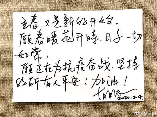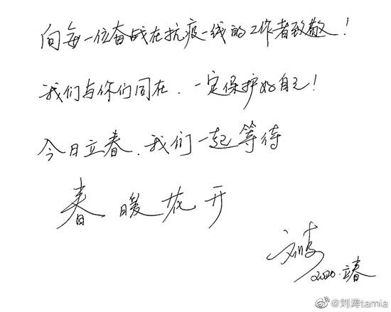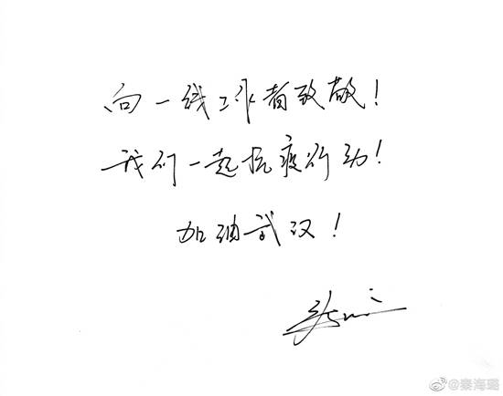 其中,黄晓明、杨幂、刘涛、张杰、陈赫、迪丽热巴等超过230位明星参与到微博的#手写加油接力#活动中。吴奇隆邀请小虎队成员陈志朋、苏有朋接力声援防疫,三人分别在微博晒出手写为防疫加油的照片。 刘涛、秦海璐、黄晓明手写加油持续接力,向一线医护工作人员致敬。刘涛写道:“向每一位奋战在抗疫一线的工作者致敬,我们与你同在,一定保护好自己!今日立春,我们一起等待,春暖花开。”随后,好友秦海璐接力完成加油挑战,她写道:“向一线工作者致敬,我们一起抗疫行动,加油武汉。” 紧接着,黄晓明在微博晒出手写加油声援防疫的照片,并发文:“万众一心,同舟共济,武汉加油!中国加油!有爱就会有力量!”该话题#手写加油接力#阅读量近8亿,登上微博热搜榜。