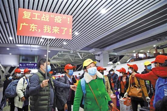 这是广东省人社厅和云南省人社厅共同策划开通的“滇粤劳务协作返岗专列”,全力帮助云南省内有意愿外出的劳动力返岗复工。乘坐首趟“返岗专列”的外出务工人员,出发前均在当地进行了相应的身体检查和疫情排查,云南省人社厅还派出工作人员和医务人员随车服务,监测务工人员体温和身体状况。 唐洽友告诉记者:“之前,因村里封村封路,我还担心今年能不能出来打工。后来得知,有免费的‘返岗专列’前往广州,我的心就放下来了。” 以前为了省钱,每年返岗唐洽友都坐客车来广东,他说:“每次要坐大概12个小时的车,下车时腰酸背疼。这回坐高铁,既舒服又快捷。” 22时25分,列车缓缓进站。广东省人社厅的工作人员和近20辆大巴车已在站外等候。待务工人员测温登记完毕后,将送他们分别前往广东各市,直接返厂。 广东省人社厅副厅长葛国兴介绍:“今年受疫情影响,节后短期缺工现象比往年更为突出。”广东加强与劳务输出省份沟通对接,对疫情相对平稳、来粤就业人员相对集中的云南、四川等省份,联合当地人社部门共同组织开行“点对点”返粤返岗专列,为务工人员提供全流程的返岗对接服务。 据介绍,接下来还将有十余趟“返岗专列”从广西、四川、云南等地陆续开出。
