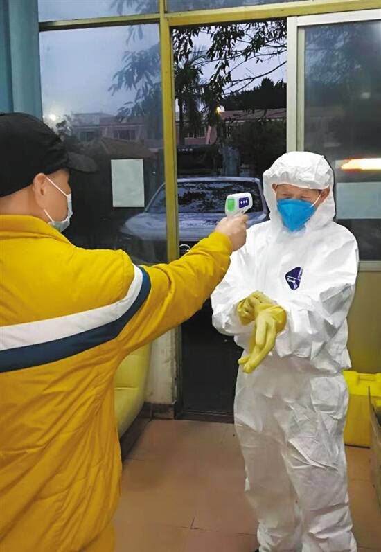 饶迟生每天上班前都要套上防护服并测量体温 梁怿韬 丘水风 摄 |
