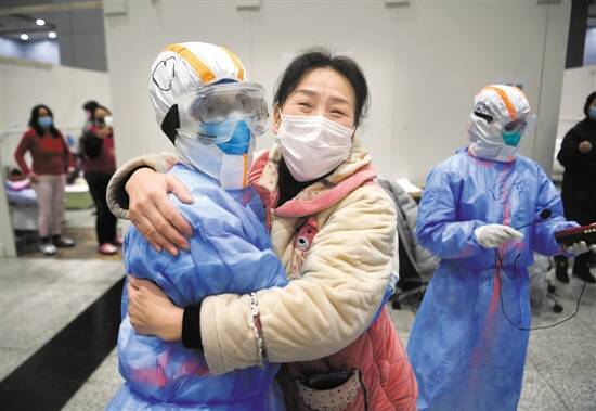 江汉方舱医院,一名患者与医护人员拥抱在一起 羊城晚报特派武汉记者 汤铭明 摄 |