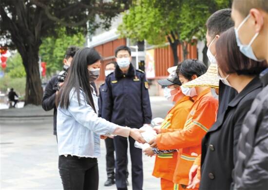 石湾酒厂集团党委副书记彭美玲为环卫工人送上口罩 |