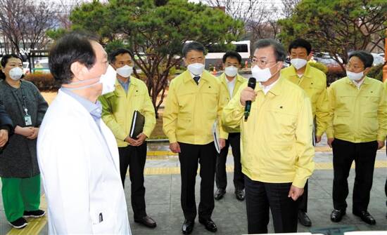 25日,韩国大邱,总统文在寅(前右)与当地医务人员交流 新华社发 |
