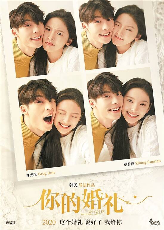 通过高口碑、高人气电视剧《想见你》俘获不少粉丝的2020年新晋“国民男友”许光汉,将携手《悲伤逆流成河》中的“白月光”章若楠,共同演绎一生一次的初恋记忆。这也是许光汉首次担任院线电影的男主角。 据悉,本次官宣物料均于春节前拍摄完成,之后因为疫情而延迟了官宣。影片将在疫情稳定并得到拍摄允许后开机,计划在今年上映。 《你的婚礼》讲述一对恋人在15年的得到与失去中,成为更好的自己的故事。在片方发布的首版海报中,许光汉和章若楠亲昵地脸贴着脸,上演甜度爆表的大头贴四连拍。 在近日大结局的高评分电视剧《想见你》中,许光汉用演技征服了一大批观众,收获了超高人气。 而出演女主角的章若楠同样也是在最近两年中备受关注的新晋演员,她因在话题之作《悲伤逆流成河》中的校花“顾森湘”一角为观众所认识,且在出道之初便因阳光甜美的形象而被粉丝封为“氧气女神”。 (李丽)