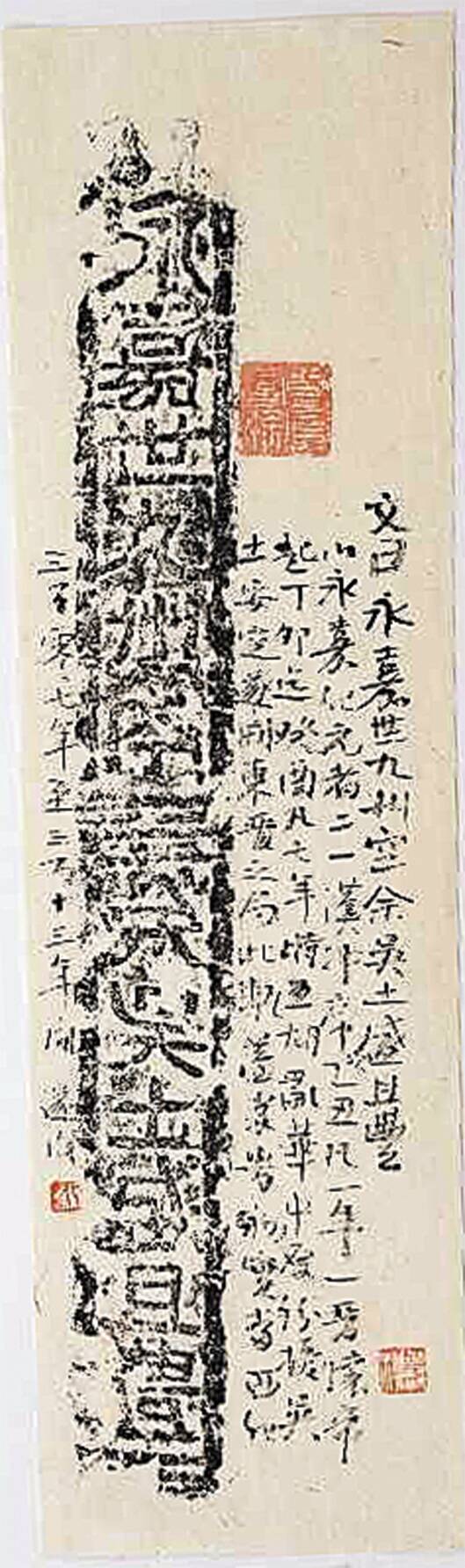 ▲“永嘉世九州空余吴土盛且丰”砖拓片(307-313年) 鉴题钤印:何遂(白文) 鉴藏印:寿祺(白文) |