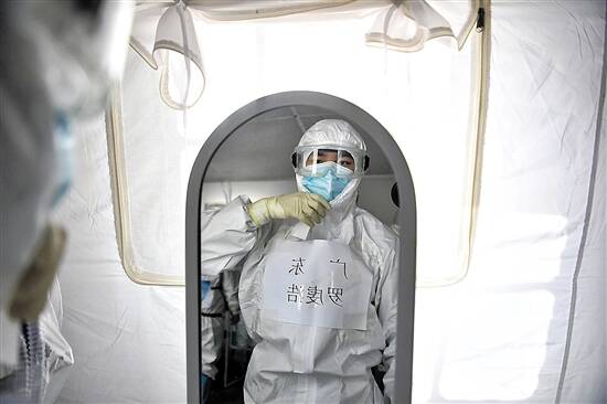 罗虔浩正在穿防护服,准备进入方舱工作 |