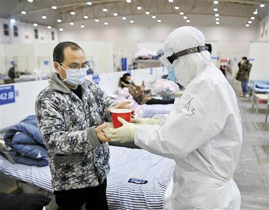 文/羊城晚报特派武汉记者 张豪 图/羊城晚报特派武汉记者 汤铭明 四方格里的床位,整齐划一。每两排床位中间用木板隔断,木板一面为枕头。格子里,有人半卧在床玩手机,有人坐着与邻床聊天……这里就是被称为“生命之舱”的方舱医院。 1999年出生的罗虔浩是广东医疗队年龄最小的男护士,刚过21岁生日,支援前在肇庆四会人民医院负责院前急救。2月9日,他随广东第十一批医疗队出征湖北,目前是武汉客厅方舱医院(又称东西湖方舱医院)的一名责任护士。2月29日,记者跟随罗虔浩,体验了他每天穿梭在方舱医院里的苦与乐。 “进舱之前不敢吃太多” 武汉客厅方舱医院护士采用的是四班轮流制,2月29日,罗虔浩上的是P班,即下午2时到晚上8时。虽说工作6小时,但加上穿脱防护服,他们往往需要花8个小时。 上班前的午饭,罗虔浩只简单吃了一点蔬菜,扒拉了两口饭。“进舱之前不敢吃太多,尤其是油腻的,怕出现生理问题(指上厕所),渴了饿了只能忍着,晚上多吃点补回来。”他笑着说。 下午1时,罗虔浩乘班车抵达武汉客厅方舱医院。医院位于汉口金银潭,在金银潭医院正对面。2月9日,这里由“展厅”变成了“方舱医院”,收治新冠肺炎患者。 在武汉客厅B厅正门口前,有几间大帐篷,处在正中间的是医护人员穿戴防护服的地方。在更衣室量完体温,他穿上防护服,戴上口罩、头套、手套,穿上鞋套、靴套……把自己包裹严实。此时,已经是13时50分。 准备进舱时,罗虔浩在入口处扛了一桶20公斤的纯净水。“给舱里患者喝的,进舱之前就顺便带一桶进去。”罗虔浩说。 穿过三个空间,打开三道门,他进入方舱医院开始和上一班的护士交接任务。“今天下午又有5位患者出院了。”他接过未完成的任务清单,笑着说。 罗虔浩最开始进入方舱医院工作时,需要负责47个患者。如今,约一半患者已经出院。“看到患者出院,我很开心。他们越早出院,我就可以越早回家。” 21岁生日前出征武汉 2月8日晚12时,罗虔浩刚洗漱完正准备睡觉,护士长在工作群里发了一则征集支援武汉的信息。抱着学习的心态,罗虔浩报了名。 没想到,凌晨1时,他就接到护士长通知,让他连夜收拾行李准备出发。 到武汉后,经过几天的培训,2月14日,罗虔浩正式进舱工作。碰巧这天也是他的21岁生日。“那天第一次穿了6个多小时的防护服,感觉整个人都缺氧,回去后只想瘫在床上,没心思想什么生日。” 因工作安排,罗虔浩和其他四位广东医疗队员被安排在山东医疗队,一起协助管理武汉客厅方舱医院B厅。罗虔浩年纪小,队友们都叫他小罗。 “小罗,下午有5位患者出院,你先去把他们的行李消毒一下。”走进护士站,罗虔浩领到B厅护士长娜姐安排的任务后,便拿起喷雾瓶前往消毒。 由于要出院的5位患者的床位并不在一起,罗虔浩花了半个小时,才完成所有的消毒工作。紧接着,他又跟其他两位护士一起,背起消毒喷洒器械,站在患者出院的门口,为患者挨个全身消毒。“这个消毒喷洒器械还是蛮重的,女生不一定拿得动。”他说。 送完患者出院后,罗虔浩开始收拾出院患者的床单,对床位进行无死角消毒。一转眼,他已经转战到其他病房,在给患者发药、发餐、测量生命体征……不知不觉,6个小时过去了,罗虔浩如同陀螺一般,几乎没有停歇过。 “累吗?”记者忍不住问。 “还好。”罗虔浩说。 自2月9日出发到2月29日,罗虔浩已经在武汉呆了整整二十天。这次逆行,他打破了人生中很多个第一次:第一次出省、第一次到武汉、第一次见方舱医院……“很庆幸自己能来武汉支援,感觉自己长大了。”罗虔浩说道。