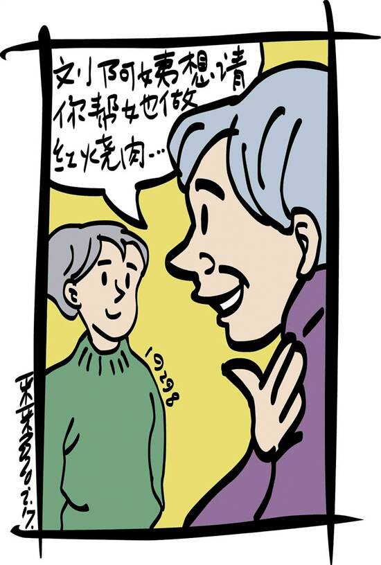 傍晚,老妈出去跳广场舞,把中午留下的半锅红烧肉加热之后,都带了出去,说是要让老姐妹尝尝儿子的手艺。 不久后的一个周末,老妈领着刘阿姨,刘阿姨拎着一大块猪肉来到李昊家,让李昊帮忙做红烧肉。李昊不明就里,老妈说:“儿子你不知道,我们这帮老姐妹之前一直想买彩票,可感觉中奖太渺茫,她们听说你上次买彩票中奖了,都跃跃欲试,这不,你刘阿姨率先中了奖,上次吃了你做的红烧肉,非常好吃,中奖后就买了十斤猪肉,想请你帮她做,要请我们这帮老姐妹的客。” “恭喜刘阿姨中奖!乐意效劳!”李昊说完就进厨房忙活起来了。一大锅红烧肉做好,又把刚买的一箱干红葡萄酒拿出来,给阿姨们倒上。李昊问:“各位阿姨,吃过红烧肉后,你们有什么活动?”刘阿姨大声说:“都约好了,一起买彩票去。”“对,买彩票去。”阿姨们异口同声,说完哈哈大笑起来。 (尚庆海)