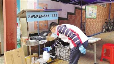 ⬅竹丝岗社区志愿者在为居民快递进行消毒 羊城晚报记者 谭铮 摄 |