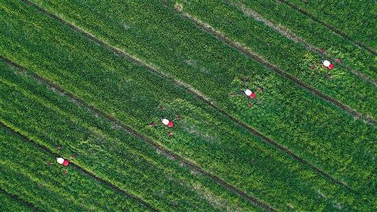 江苏淮安岔河镇的农民正在使用无人机进行喷药作业 |