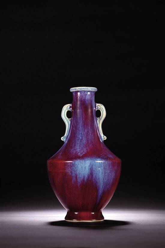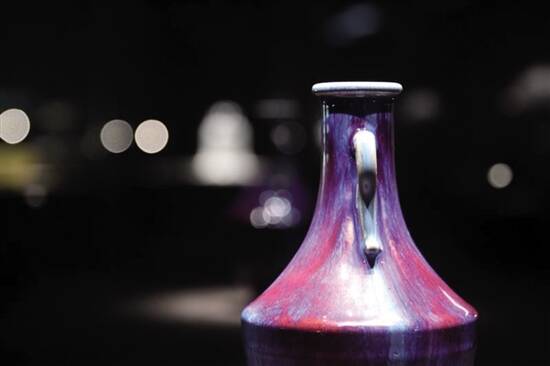 ▲ 藏品窑变釉双耳瓶在广东省博物馆“五色祥云”——自得堂藏宋元明单色釉瓷器展展出 图/作者提供 |