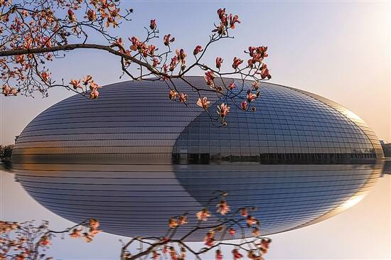 ▲3月11日 ,北京国家大剧院外的玉堂春尽染春色 (视觉中国/供图) |