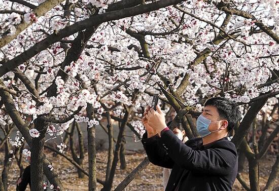 ▶3月11日,河南省宝丰县闹店镇张沟村的杏树林中,赏花人在拍照 (新华社 李安 摄) |
