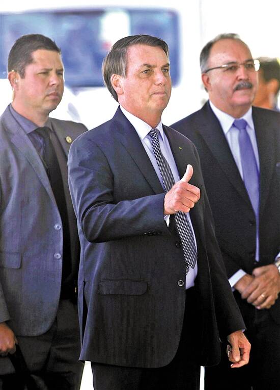 3月17日,在巴西首都巴西利亚,巴西总统博索纳罗(中)到达总统官邸。 博索纳罗17日在其社交媒体宣布,他本人第二次新冠病毒检测呈阴性。 新华社发