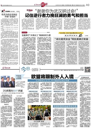 2020年3月18日/星期三/ 要闻部主编/责编 郭斌 钱克锦/ 美编 肖莎/ 校对 潘丽玲