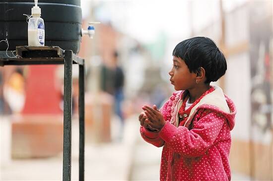 3月23日,在尼泊尔首都加德满都的杜巴广场,一名小女孩认真洗手。 尼泊尔政府23日晚宣布,将于24日起在全国范围实施为期一周的“封城”措施,以防止新冠肺炎疫情蔓延。 新华社发