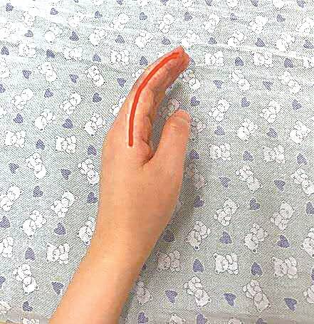 大肠经在宝宝的食指桡侧面。让宝宝手掌打开,暴露食指桡侧面,家长用食指和拇指捏住宝宝的食指,沿着食指桡侧面的大肠经从指根推到指尖,推的时候动作要迅速,每侧手指各200下,如果孩子年龄偏大,次数可以更多。