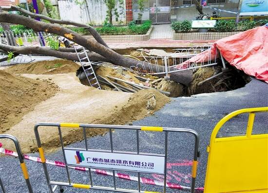 影响 9条公交线绕行 31日上午9时许,记者查看百度地图、高德地图等软件发现,广州交警已在上述地图软件中发布了“东晓南路北向南路面沉陷”的信息。东晓立交北往南方向东晓南路出口封闭。 据广州交通官方微博消息,受东晓南路昌岗街道办事处路段临时交通管制影响,公共汽车5、35、70、263、273、276、287、967、542等9条线路采取临时绕行等调度方式。 31日中午1时许,记者在东晓南路地陷现场看到,该路段双向车道已经封闭,通行车辆需绕道晓港中马路通行。塌陷处已被围蔽,树木倒地的残枝败叶已被清理,多辆抢修车辆在现场工作,推土机将货车运来的数车黄沙倒入地面塌陷坑口。 原因 雨水冲刷所致 记者从广州城市排水有限公司工作人员处了解到,该处地陷发生在31日早上5时许,目前地质专家已经对塌陷区域进行前期勘测,可以确保后期不会发生塌陷面积继续扩大的情况。昌岗街道办事处彭先生告诉记者,东晓南路地陷附近小区的用水用电暂不受影响。广州城市排水有限公司南区运营分公司陈经理向记者证实了上述说法。 据陈经理介绍,发生在东晓南路的地面塌陷是由近日连续降雨雨水冲刷所致,塌陷面积约为12平方米,深度3米。 附近社区门口贴出的一张署名为广州市城市排水有限公司的告示显示,因路面下陷情况,导致污水管塌陷,马涌2号泵站需停产配合修复,此期间可能对周边环境造成一定的影响。陈经理称,地陷对附近居民区的日常污水排放无影响。 通报 无人员伤亡和被困 3月31日下午,广州市城市排水有限公司针对东晓南路地陷的情况发布官方通报。通报称,3月31日清晨,海珠区晓港中马路147号对出路面近人行道位置出现路面坑洞和路树倒伏情况,现场未造成人员伤亡和被困。经专家组现场勘查,初步判断原因为近期雨水冲刷所致,具体原因待进一步核查。